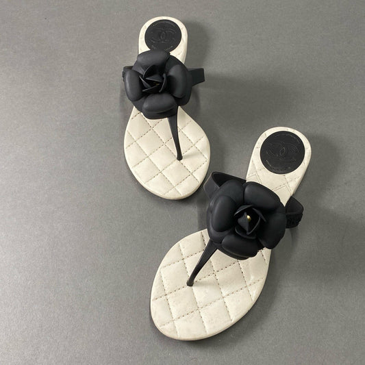 7f18 CHANEL シャネル カメリア ビーチサンダル トング 37 ホワイト ブラック ココマーク イタリア製 フラワー シューズ