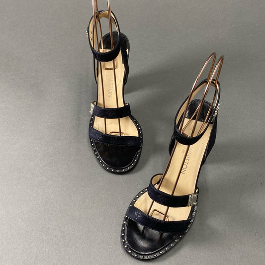 9f18 LOUIS VUITTON ルイヴィトン モノグラム スタッズ アンクルストラップ ヒールサンダル 35 ブラック レザー イタリア製 パンプス