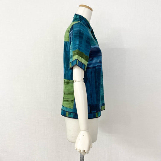 59e20 LEONARD SPORT レオナール スポーツ 半袖Tシャツ カットソー トップス 伸縮ストレッチ素材 サイズ38 ブルー マルチカラー コットン100% レディース 日本製