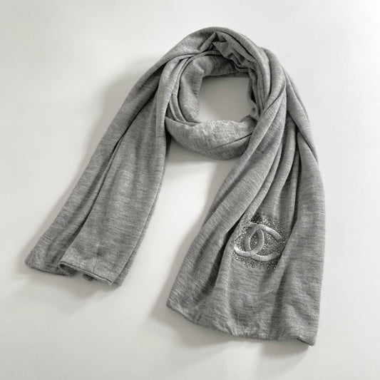 d12-4 CHANEL シャネル CC ココマーク ラインストーン カシミヤ シルク マフラー ストール ショール グレー イタリア製