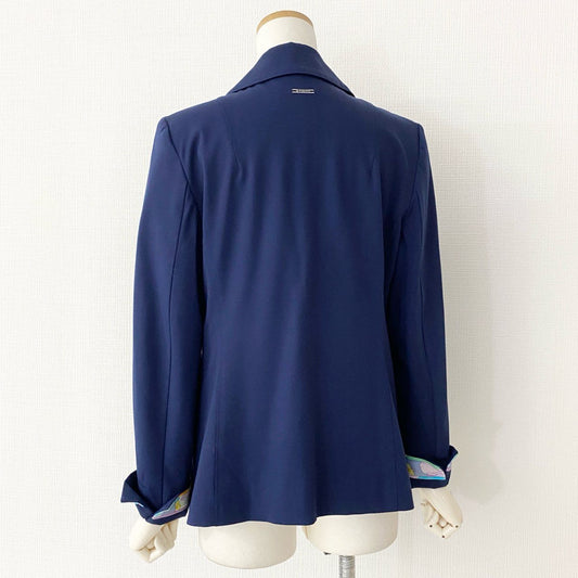 50c23 LEONARD SPORT レオナール スポーツ 袖プリント テーラードジャケット ブレザー 40 ネイビー 日本製 花柄 メタルプレート 春