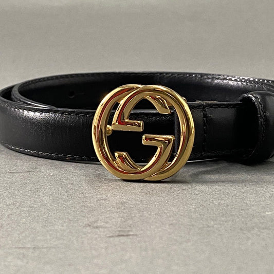 b8-7 GUCCI グッチ 70・20・036・1766・0980・0 イタリア製 インターロッキングG ベルト GGバックル 細ベルト ブラック レザー MADE IN ITALY