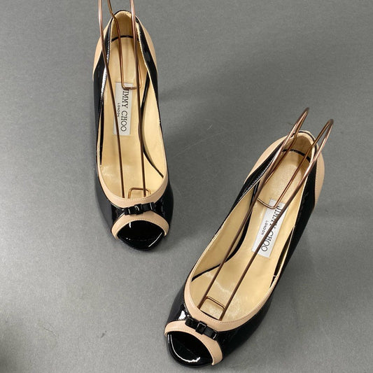 8d21 【極美品】 JIMMY CHOO ジミーチュウ オープントゥ レザーパンプス 247AGNES 37 ブラック/ベージュ レディース 靴