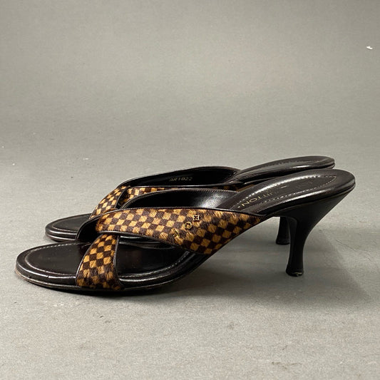 5f28 LOUIS VUITTON ルイヴィトン ハラコダミエ ヒールサンダル 38 ブラウン レザー イタリア製 シューズ モノグラム LV