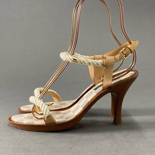 5f28 LOUIS VUITTON ルイヴィトン ダミエ アズール ロープストラップ ヒールサンダル 36 1/2 ホワイト ブラウン レザー イタリア製 シューズ パンプス