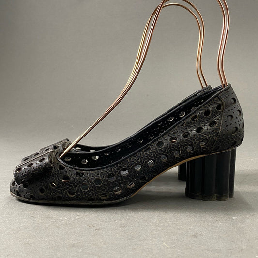 5f28 Salvatore Ferragamo サルヴァトーレ フェラガモ ヴァラリボン フラワーヒールパンプス 5 1/2D ブラック レザー Leather 編み込み イタリア製 シューズ
