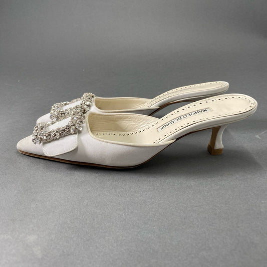 3b24 イタリア製 MANOLO BLAHNIK マノロブラニク ヒールサンダル ミュール ビジューサンダル ポインテッドトゥ 花柄バックル 36 ホワイト レディース