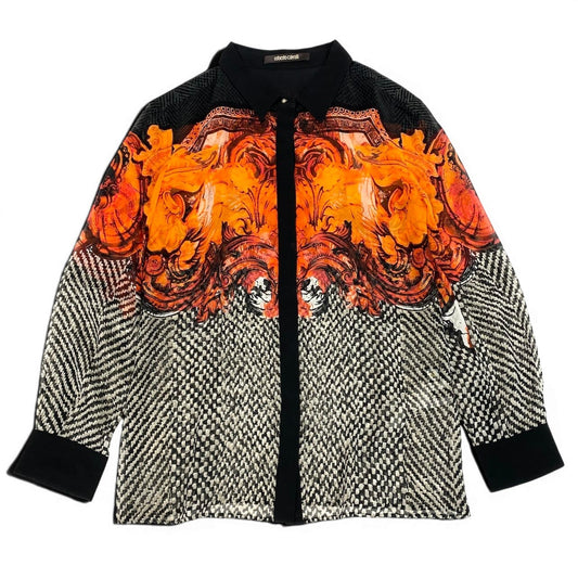 Ad21 roberto cavalli ロベルトカヴァリ シースルーシャツ コットンシャツブラウス 総柄 42サイズ オレンジ ブラック コットン100% レディース 女性用t18r