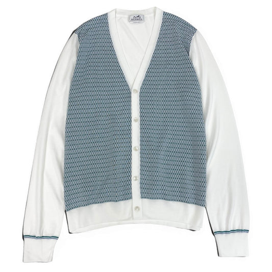 Ed21 【新品保管品】HERMES エルメス Vネックカーディガン コットンカーディガン ニットセーター 総柄 Lサイズ ホワイト グリーン ブルー コットン100% レディース 女性用t18r