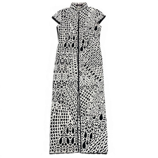 Ed21 LEONARD レオナール 半袖ロングドレスワンピース スリット 幾何学模様 総柄 0170501 Lサイズ ホワイト ブラック レディース 女性用t18r