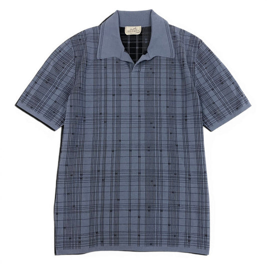 Md21 【新品保管品】HERMES エルメス 半袖ニットポロシャツ コットンシャツ チェック柄 トップス イタリア製 Lサイズ ブルー コットン100% メンズ 男性用t18r