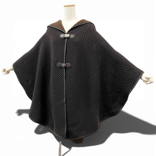 85b9 《美品》 Salvatore Ferragamo サルヴァトーレフェラガモ ニットポンチョ ケープコート ガンチーニターンロック レザーパイピング S ブラウンk02i