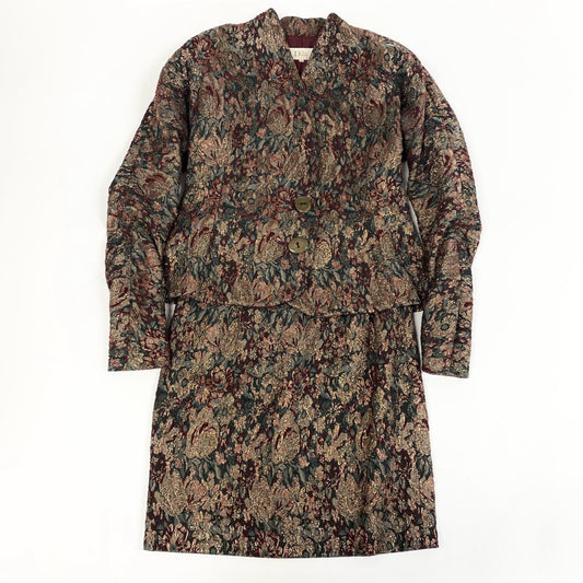 62a28 Vintage Christian Dior ヴィンテージ クリスチャンディオール タペストリー柄 セットアップ ジャケット スカート Tapestry Brocade Skirt Suit Floral M レッド ゴールド レディースo07t