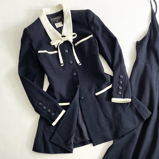 21j21 CHANEL シャネル 96C P06258V04503 スーツ セットアップ ジャケット/ワンピース ココマークボタン サイズ42 ネイビー×ホワイト レディース VINTAGE ヴィンテージ フランス製