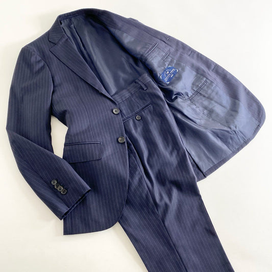 31i23 SHIPS シップス ロロピアーナ生地 4シーズン Super130's オーダー品 セットアップ 3ボタン シングルスーツ ジャケット パンツ ストライプ Sサイズ相当 ネイビー ウール メンズ