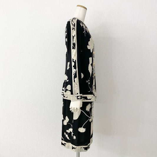 72i26 LEONARD レオナール 美しい花柄プリント スカートスーツ セットアップ 金ボタン サイズM ブラック ホワイト ウール シルク レディース 日本製