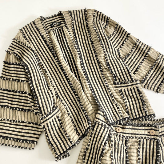 11i17 ISSEY MIYAKE PwRMANwNTw イッセイミヤケペルマネンテ 日本製 ストライプ セットアップ ジャケット タップスカート 羽織 Mサイズ ベージュ ブラック リネン コットン