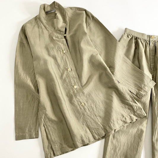 75i12 80s ISSEY MIYAKE イッセイミヤケ 筆タグ 日本製 セットアップ 長袖シャツ パンツ 9 カーキ シルク レーヨン