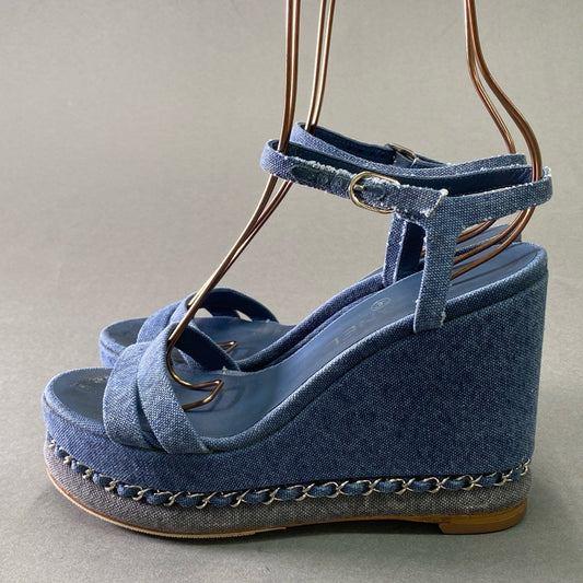 4d15 CHANEL シャネル ココマーク入り ウェッジソール デニム チェーンサンダル 36 1/2 インディゴブルー シューズ 夏 イタリア製