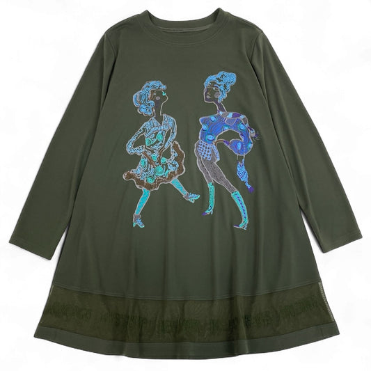 76k21《美品》 TOKUKO 1er VOL トクコプルミエヴォル ロングスリーブワンピース イラスト 刺繍 ストレッチ○ 裾切替 レディース 女性用 9 カーキu02t