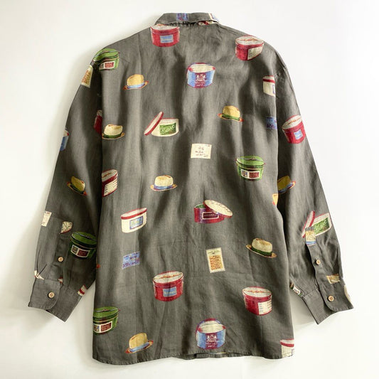 54b25 Papas パパス リネン 総柄シャツ L グレー 日本製 ワンポイントロゴ ハット 帽子 HAT BOX LINEN SHIRT