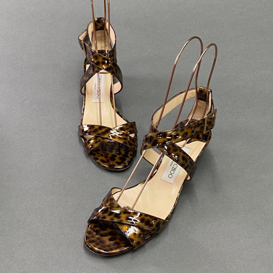 5a10 《美品》 JIMMY CHOO ジミーチュウ レオパードプリント エナメルサンダル 37 1/2 ブラウン パテントレザー イタリア製 ゴールド金具 シューズ 夏