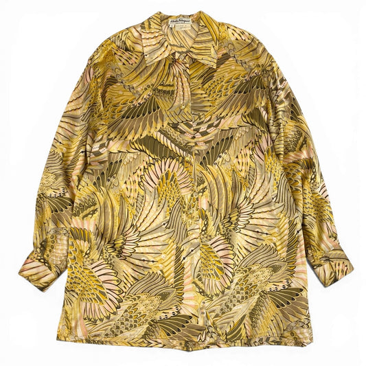 Ib26 《美品》 Salvatore Ferragamo サルヴァトーレフェラガモ シルクシャツ 長袖ブラウス トップス 金ボタン 総柄 S ゴールド シルク レディースu02t