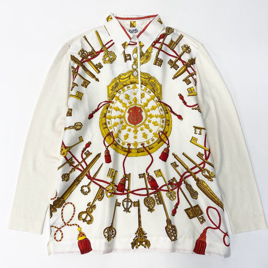 Ia29 HERMES エルメス 長袖シャツ 長袖ニットセーター 異素材切替 スカーフ柄 シルク100% イタリア製 Sサイズ ホワイト レディースo07t