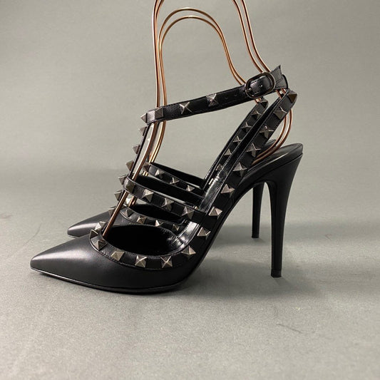 b6 VALENTINO GARAVANI ヴァレンティノ イタリア製 ロックスタッズ アンクルストラップ ハイヒール パンプス シューズ 37 ブラック レザー MADE IN ITALY