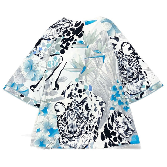 69L17 LEONARD レオナール チュニック ロングスリーブカットソー 美しい花柄プリント ストレッチ素材 トップス 36サイズ ホワイト ブルー レディースo07t