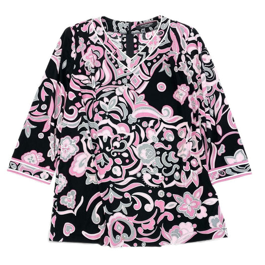 59L15 LEONAD レオナール チュニック ロングスリーブカットソー Vネック カンカン素材 総柄 トップス 40サイズ ブラック ピンク レディースo07t