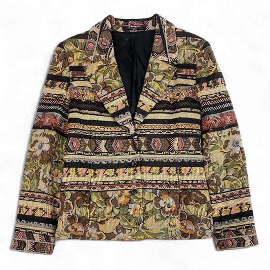 2k19《美品》 LEONARD FASHION レオナール テーラードジャケット 中綿ジャケット 総柄 美しい花柄プリント ウールシルク混 レディース 女性用 M マルチカラーu02t