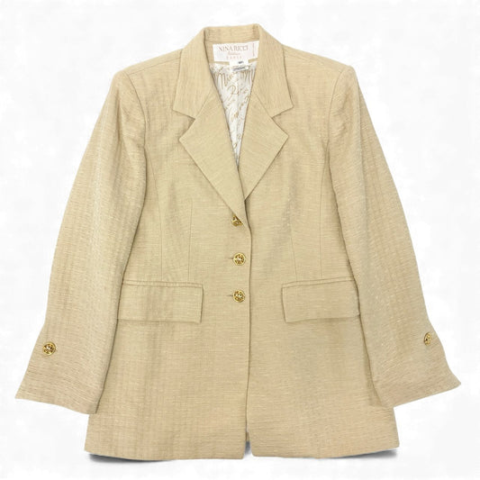 15K18 NINA RICCI Edition ニナリッチ フランス製 テーラードジャケット ロングジャケット 金ボタン 裏地総柄 レディース 女性用 42 ベージュu02t