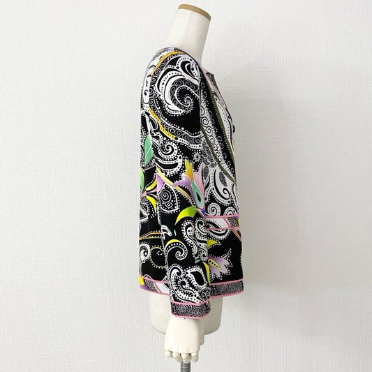 55i26 《美品》 LEONARD レオナール カンカン素地 薄手ノーカラージャケット カーディガン 羽織り 美しいプリント 0159518 サイズL マルチカラー レディース 日本製