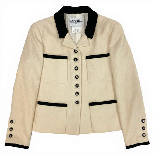 70b9 Vintage CHANEL シャネル 1996 ツイードジャケット テーラージャケット バイカラー ココマークボタン 42 アイボリー ブラック レディースta1