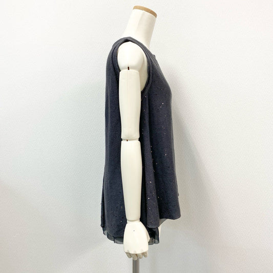 55h28 《美品》BRUNELLO CUCINELLI ブルネロクチネリ ニットベスト バックスリット リネンニット スパンコール シフォン Sサイズ グレー レディース 女性用k02i