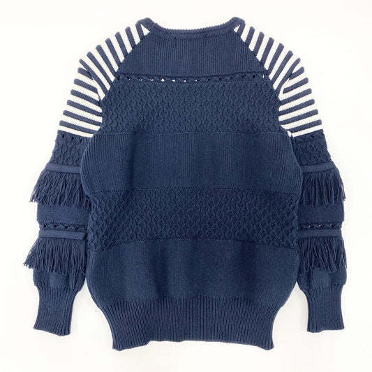 54h27 《美品》 BORDERS at BALCONY ボーダーズアットバルコニー フリンジ ニット セーター 洗える サイズ36 ネイビー ホワイト ボーダー コットン レディースu02t
