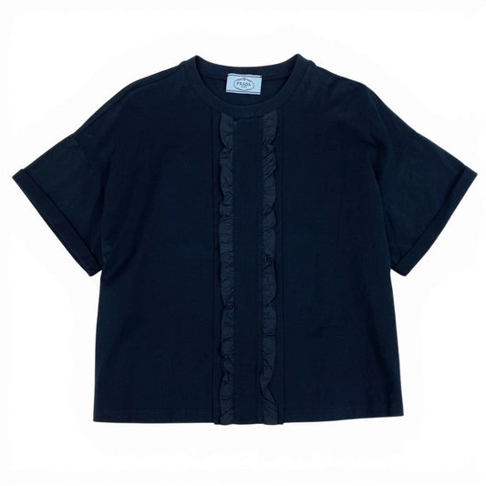 70b9 《美品》 PRADA プラダ フリル装飾 半袖カットソー Tシャツ トップス L ネイビー コットン レディースk02i