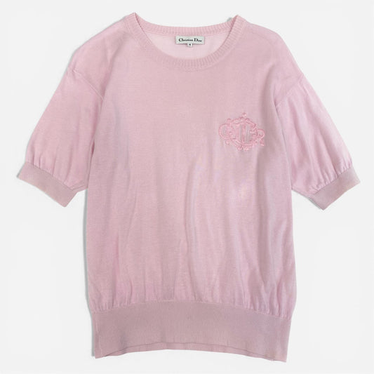 12a23 Christian Dior クリスチャンディオール 半袖ニット サマーセーター トップス エンブレム刺繍 M ピンク コットン レディースu02t