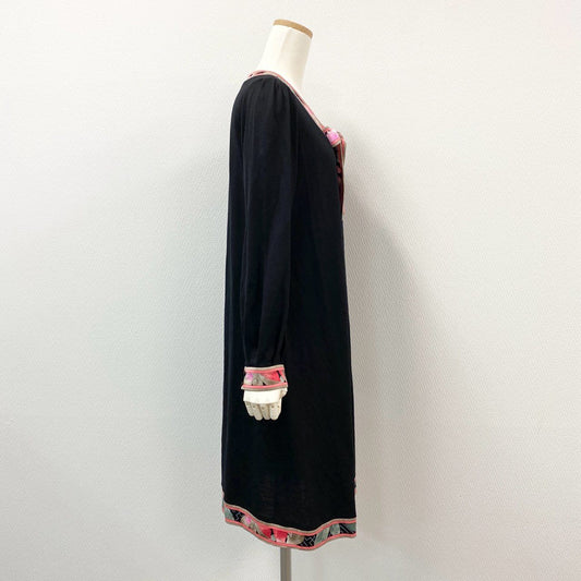 45b11 LEONARD レオナール 日本製 カンカン素材 ボウタイ リボン 長袖ワンピース チュニック ドレス Lサイズ ブラック ピンク MADE IN JAPAN
