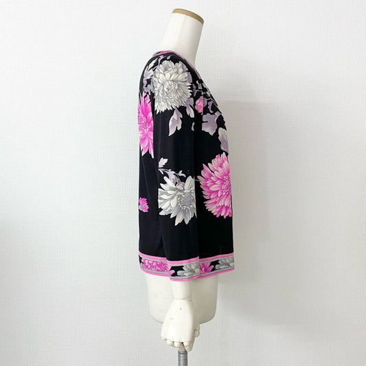 2d10-5 LEONARD レオナール 9分袖 ニット セーター 美しい花柄プリント サイズM ブラック×ピンク ウールシルク レディース 日本製