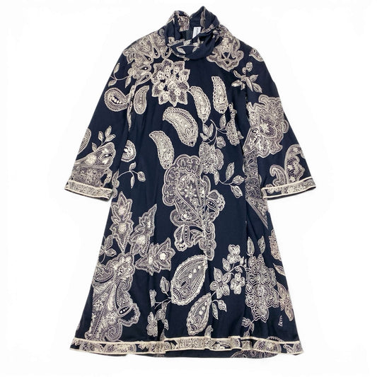 51b12 【美品】LEONARD レオナール ハイネックロングスリーブチュニックワンピース 総柄プリント 42サイズ ブラック ベージュ コットン100% レディース 女性用u02t