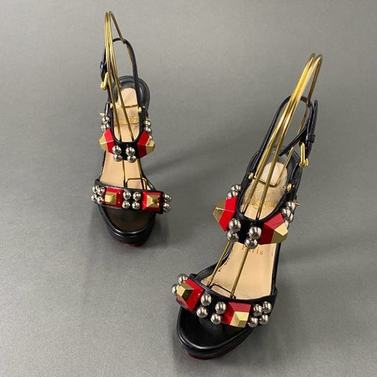 6h14 Christian Louboutin クリスチャンルブタン メタルビーズ スタッズ ストラップヒールサンダル 34 ブラック レザー シューズ イタリア製
