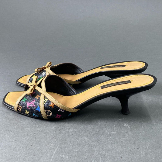 9f13 LOUIS VUITTON ルイヴィトン モノグラム レザーリボン ミュールサンダル 36 1/2 ブラック leather イタリア製 シューズ