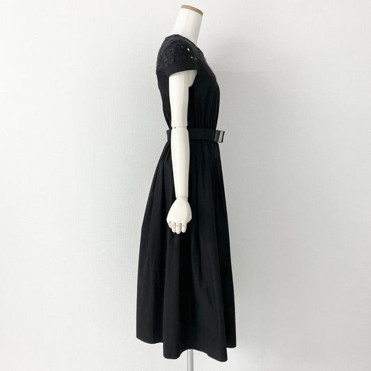 14e29 18年製 FENDI フェンディ コットンタフタワンピース 半袖 ロング丈 柄刺繍 ロゴベルト付き サイズ38 ブラック レディース 正規品