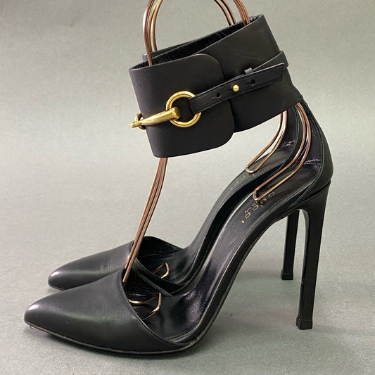 6l19 GUCCI グッチ ゴールドホースビット アンクルベルトパンプス 37 ブラック レザー イタリア製 シューズ