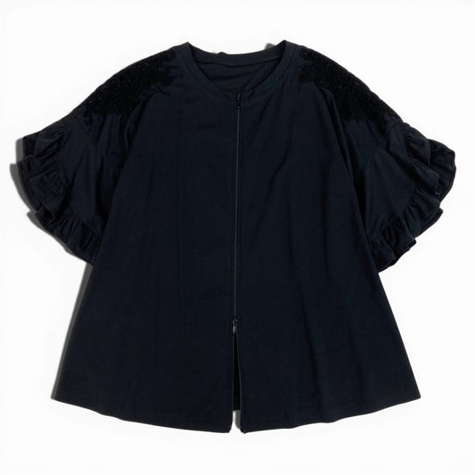 42b27 【美品】 TOKUKO 1er VOL *J トクコプルミエヴォル ノーカラージャケット ダブルジップジャケット フリルスリーブ レース装飾 サイズ9 レディース 女性服 サイズ9 ブラックu02t