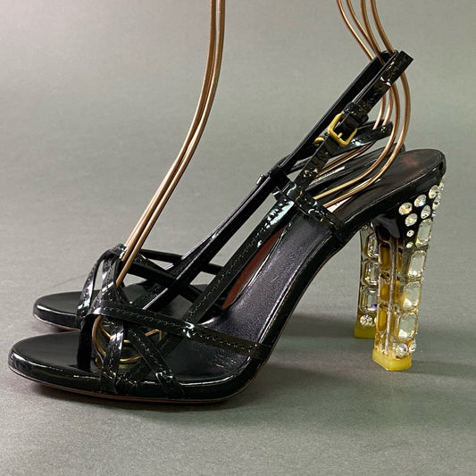 2j28 miu miu ミュウミュウ イタリア製 ラインストーン ヒール サンダル パンプス シューズ クリア 35 ブラック パテントレザー