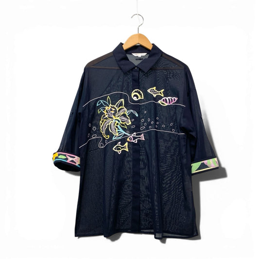2b17 【美品】LEONARD SPORT レオナール スポーツ 九分袖チュニックシャツ シャツブラウス 魚 花刺繍 シースルー 0571077 40サイズ ブラック コットン100% レディース 女性用u02t