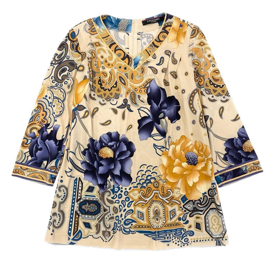 59L15 【美品】LEONARD レオナール チュニック ロングスリーブカットソー Vネック カンカン素材 総柄 トップス 40サイズ ベージュ系 レディースo07t